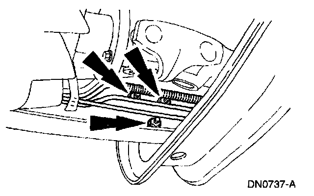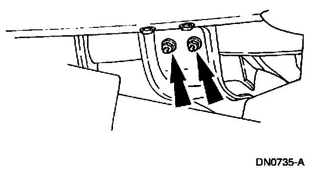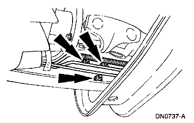 7. Remove the transmission support crossmember nuts and bolts (RH side).
