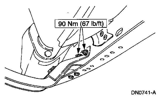7. Tighten the transmission support crossmember nuts and bolts (RH side) to specification.