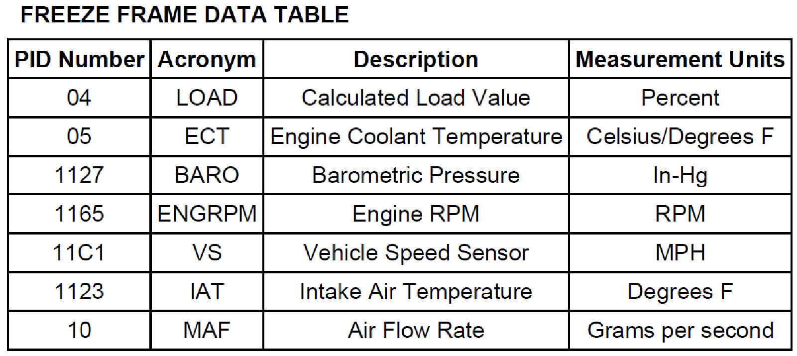 Freeze Frame Data allows access to emission related values from specific generic PIDs. These values are stored the instant an emission related DTC is stored in Continuous Memory. This provides a snapshot of the conditions that were present when the DTC was stored. Once one set of freeze frame data is stored, this data will remain in memory even if another emission related DTC is stored. When a DTC associated with the freeze frame is erased or a PCM memory reset is performed, new freeze frame data can be stored again. In the event of multiple emission related DTCs in memory, always note the DTC for the freeze frame data.