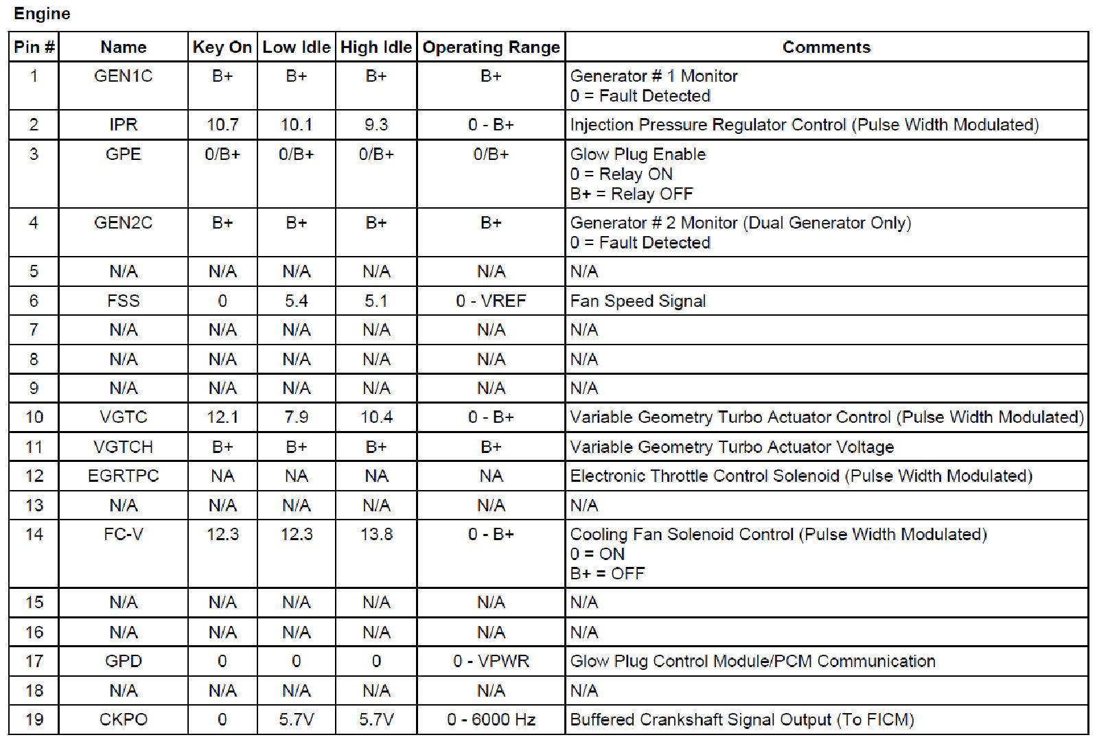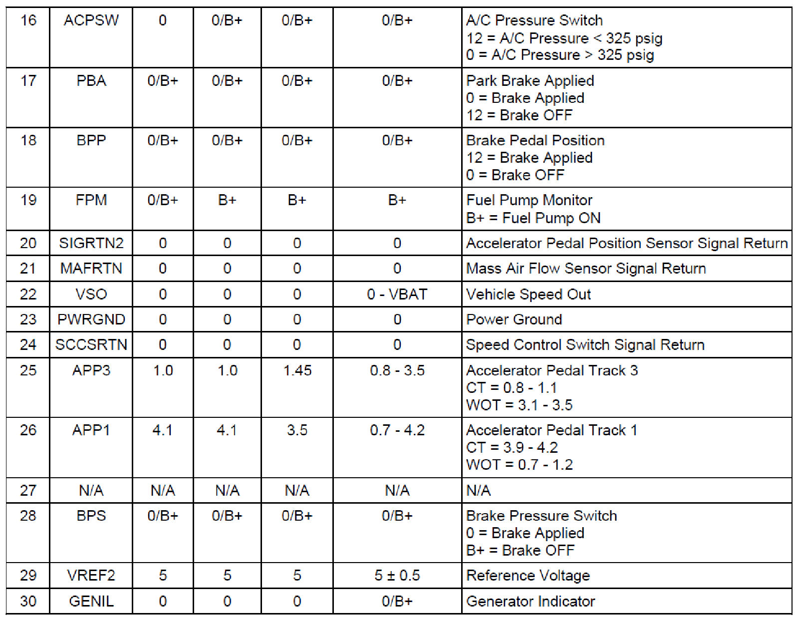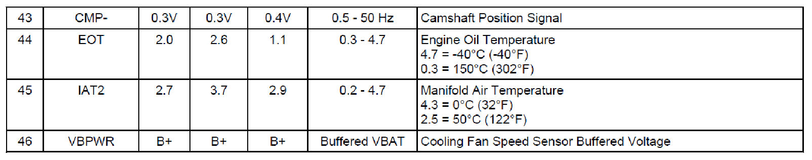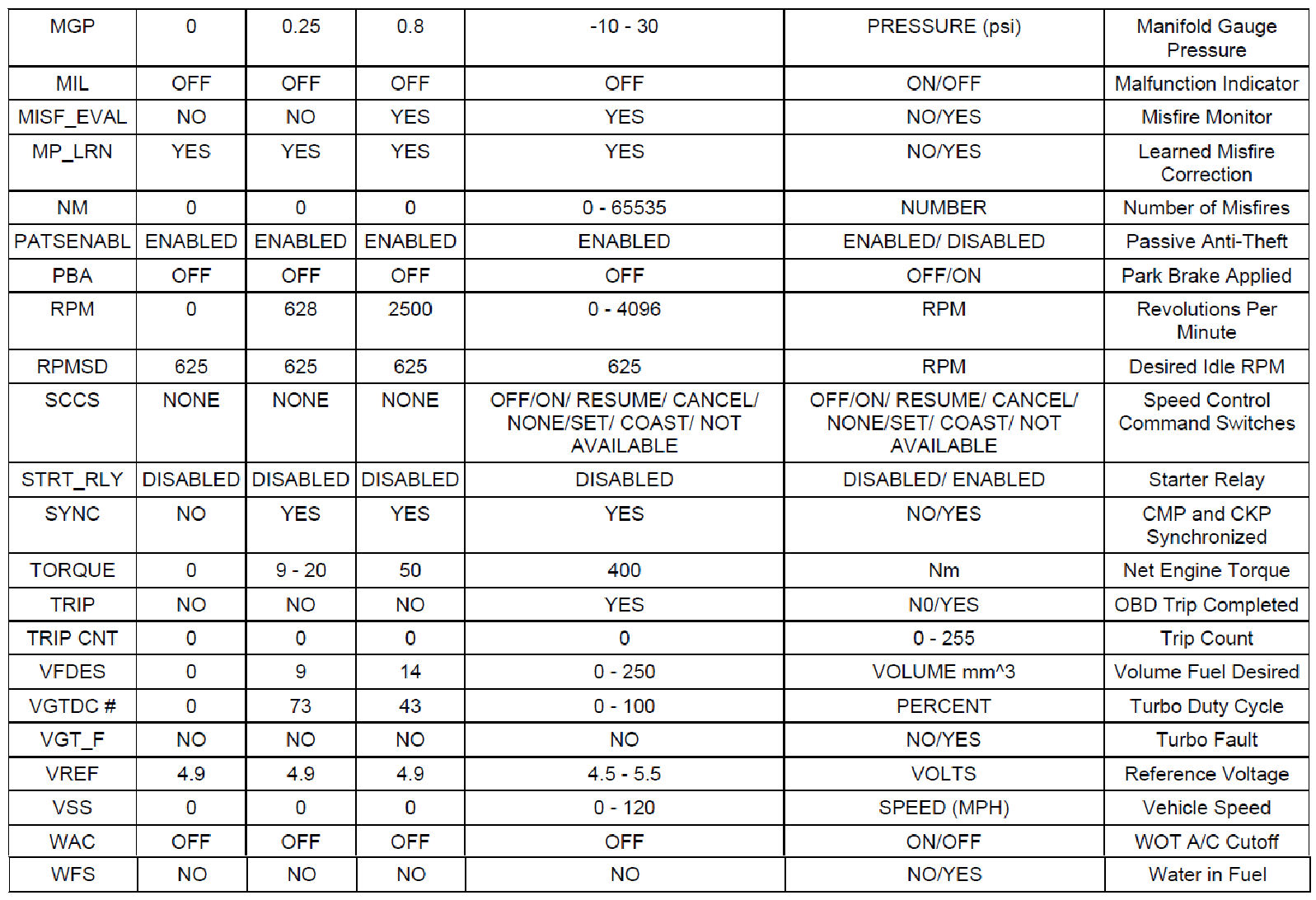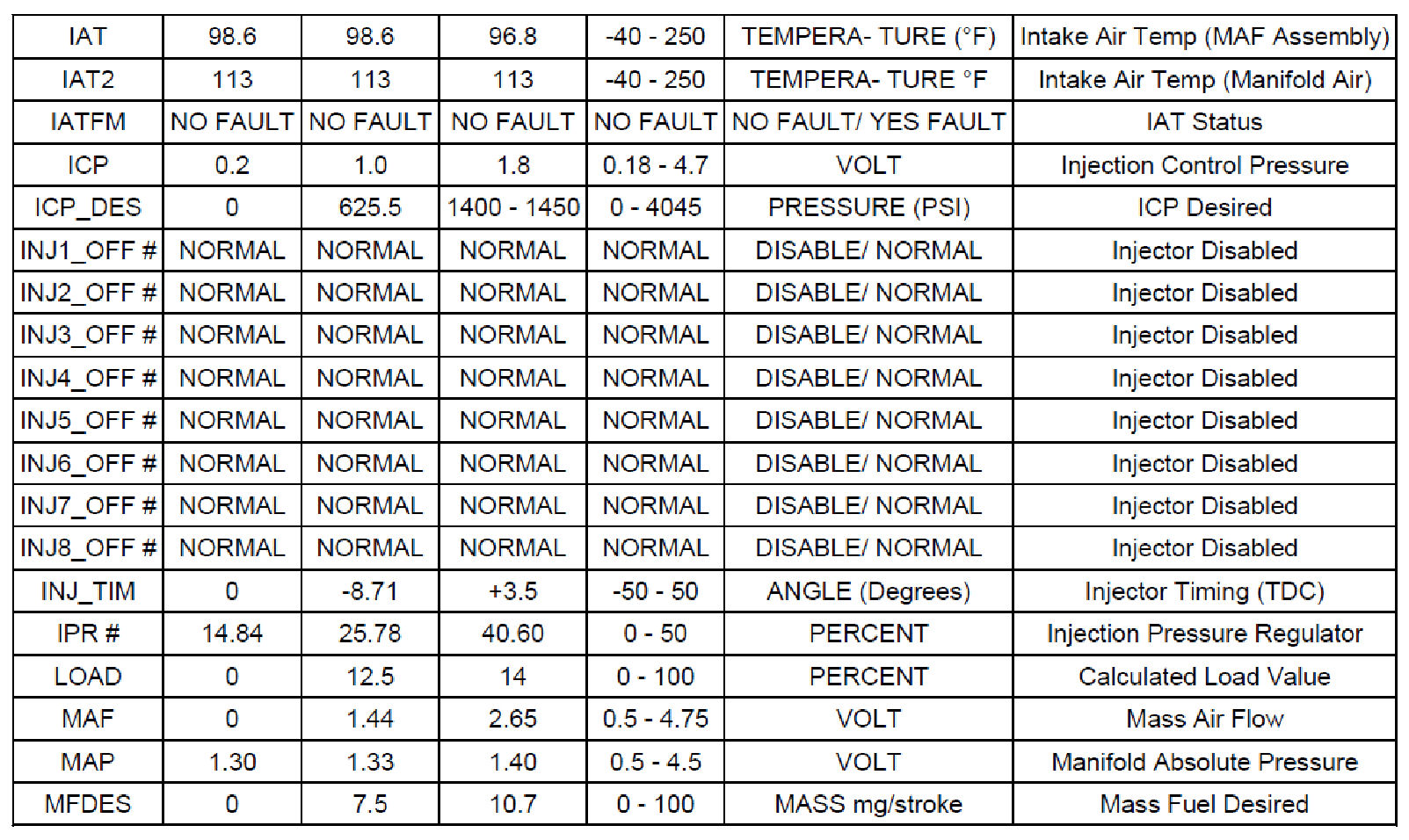 Normal Scan Data Values - Includes PIDs