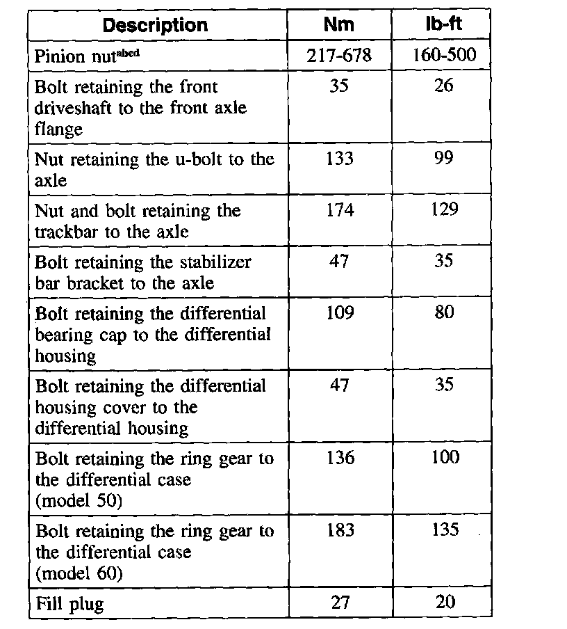 c For new pinion bearing installation on model 50 and 60 axles, tighten the pinion nut to a rotating torque of 1.7-3.4 Nm (15-30 inch lbs.) (217-678 Nm ).
