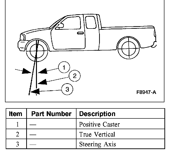 Caster is the deviation from vertical of an imaginary line drawn through the ball Joints when viewed from the side. The caster specifications will give the vehicle the best directional stability characteristics when loaded and driven. The caster setting is not related to tire wear.