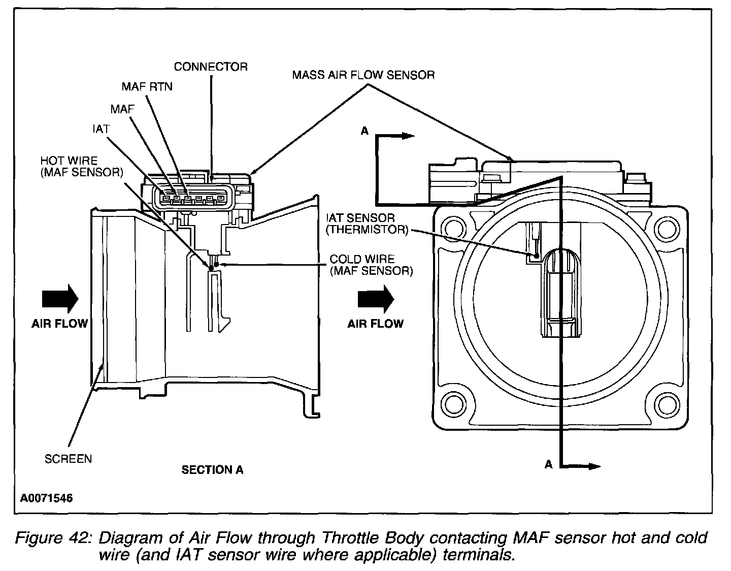 Diagram Of Air Flow Through Throttle Body Contacting MAF Sensor Hot And Cold Wire Terminals: