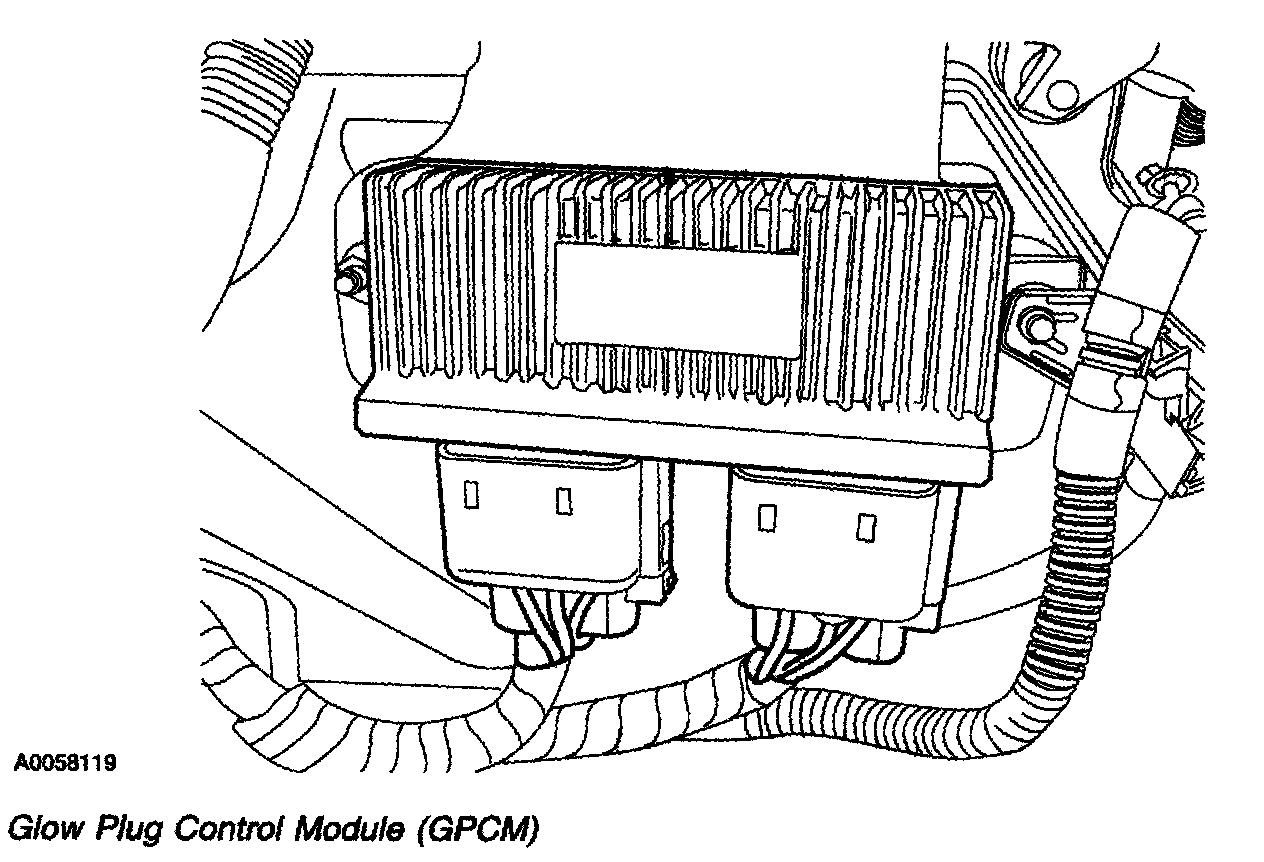 The glow plug system is composed of a solid state GPCM, glow plugs, and the associated wiring harness. The glow plug on-time is controlled by the PCM and is a function of oil temperature, barometric pressure, and battery voltage. The PCM enables the GPCM which drives the individual glow plugs. Glow plug on-time normally varies between 1 to 120 seconds. In addition to PCM control the GPCM internally limits the glow plug operation to 180 seconds regardless of the PCM commanded on-time. The power to the glow plug is provided through the GPCM solid slate drivers directly from the vehicle battery. The GPCM monitors and detects individual glow plug functionality and the control and communication links to the PCM. The failures detected by the GPCM are passed to the PCM using a serial communication signal on the diagnostic line.