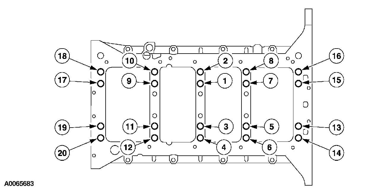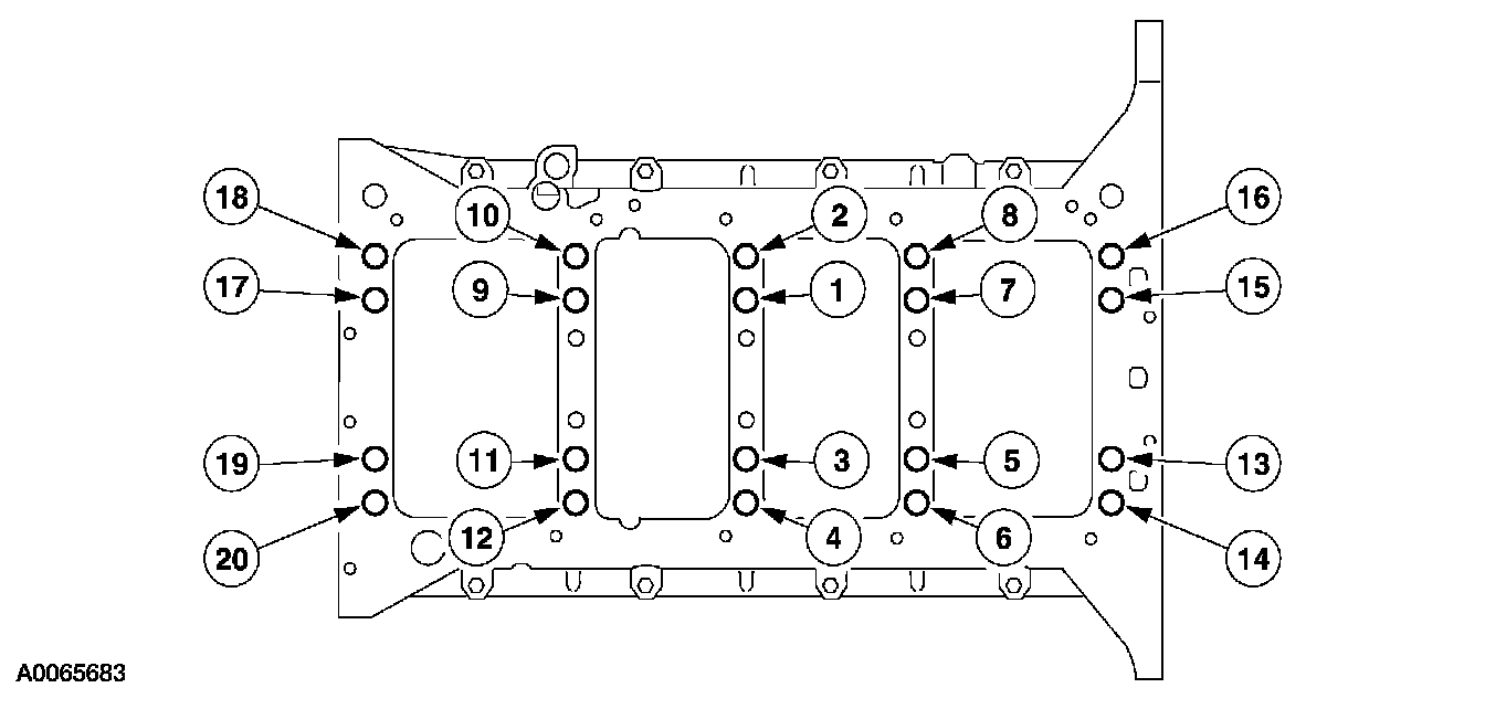 Install the lower crankcase. Install all 20 lower crankcase main bearing mounting bolts. Tighten the mounting bolts in the following sequence.