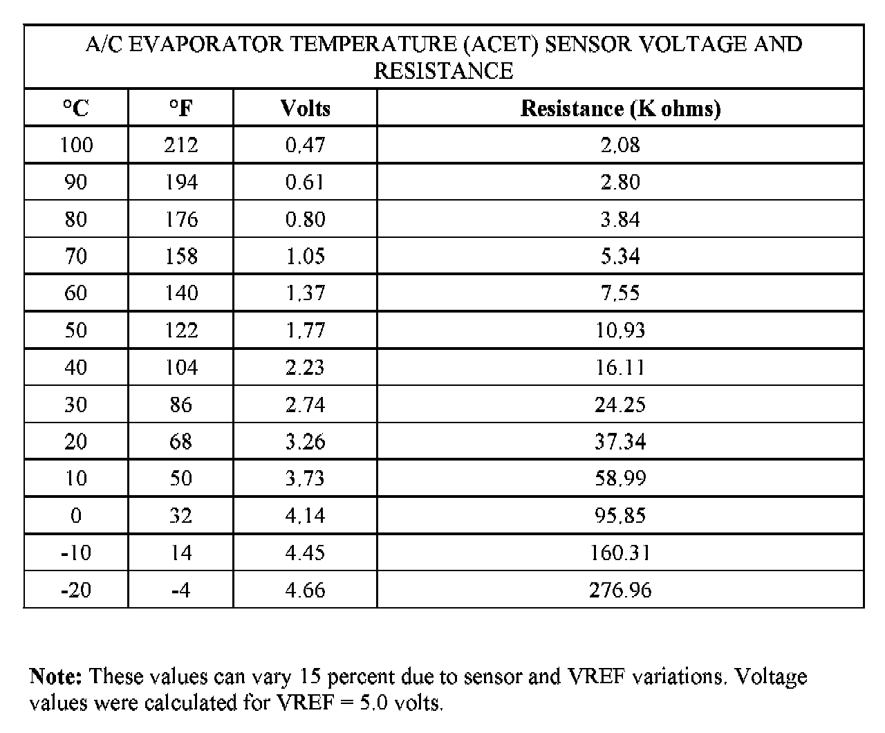The ACET sensor measures the evaporator air discharge temperature. The ACET sensor is a thermistor device in which resistance changes with temperature. The electrical resistance of a thermistor decreases as the temperature increases, and the resistance increases as the temperature decreases. The PCM sources a low current 5 volts on the ACET circuit. With SIG RTN also connected to the ACET sensor, the varying resistance affects the voltage drop across the sensor terminals. As A/C evaporator air temperature changes, the varying resistance of the ACET sensor changes the voltage the PCM detects.