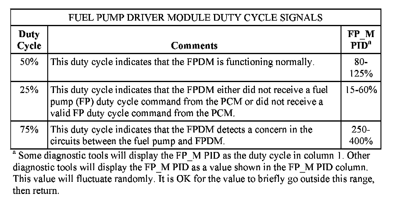The FPDM communicates diagnostic information to the PCM through the FPM circuit. This information is sent by the FPDM as a duty cycle signal. The 3 duty cycle signals that may be sent are listed in the table.