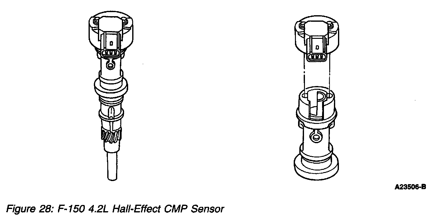 There are 2 types of CMP sensors: the 3-pin connector Hall-effect type sensor (only used on F-150 4.2L applications) and the 2 pin connector variable reluctance type sensor used on all other vehicle applications.
