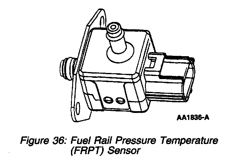 The FRPT sensor measures the pressure and temperature of the fuel in the fuel rail and sends these signals to the PCM. The sensor uses the intake manifold vacuum as a reference to determine the pressure difference between the fuel rail and the intake manifold. The fuel return line to the fuel tank has been deleted in this type of fuel system. The relationship between fuel pressure and fuel temperature is used to determine the possible presence of fuel vapor in the fuel rail. Both pressure and temperature signals are used to control the speed of the fuel pump. The speed of the fuel pump sustains fuel rail pressure which preserves fuel in its liquid state. The dynamic range of the fuel injectors increase because of the higher rail pressure, which allows the injector pulse width to decrease.