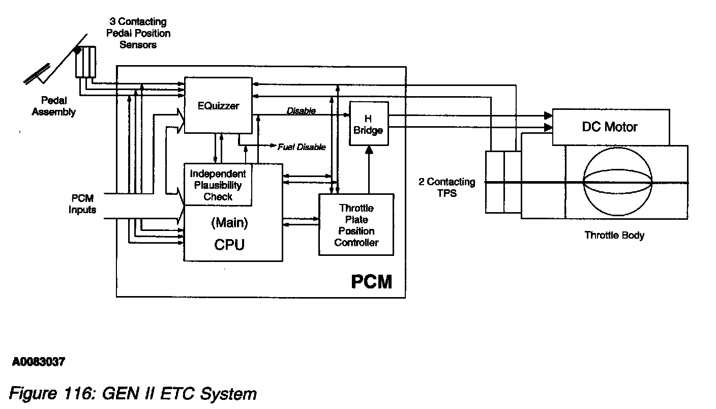 The ETC monitor system is distributed across 2 processors within the PCM: the main powertrain control processor unit (CPU) and a monitoring processor called an enhanced-quizzer (E-Quizzer) processor. The primary monitoring function is carried out by the independent plausibility check (IPC) software, which resides on the main processor. It is responsible for determining the driver-demanded torque and comparing it to an estimate of the actual torque delivered. If the generated torque exceeds driver demand by a specified amount, the IPC takes appropriate corrective action.