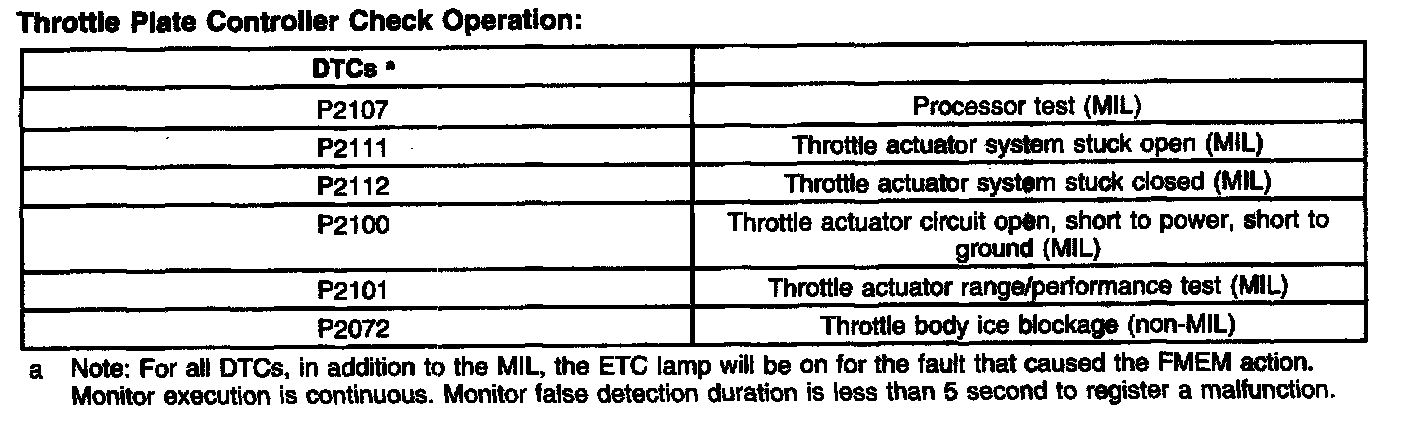 It should be noted that the ETC system includes a warning indicator (wrench light) on the instrument cluster that illuminates when a fault is detected. Faults are accompanied by DTCs and may also illuminate the malfunction indicator lamp (MIL).