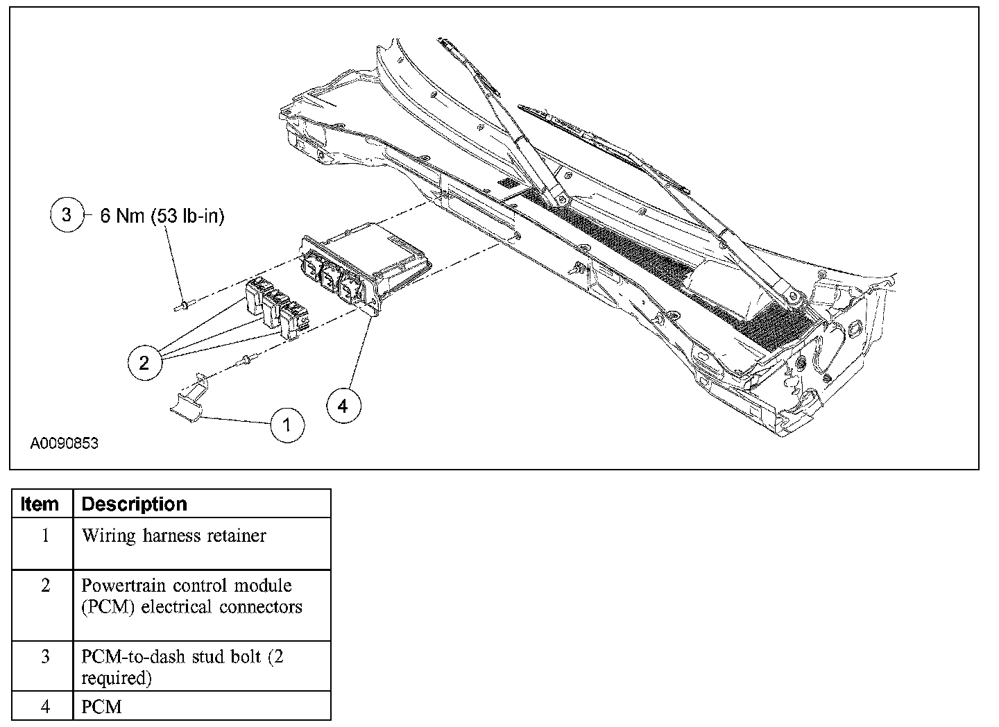 2. Remove the powertrain control module (PCM) stud bolt nut and position the wiring harness aside.
