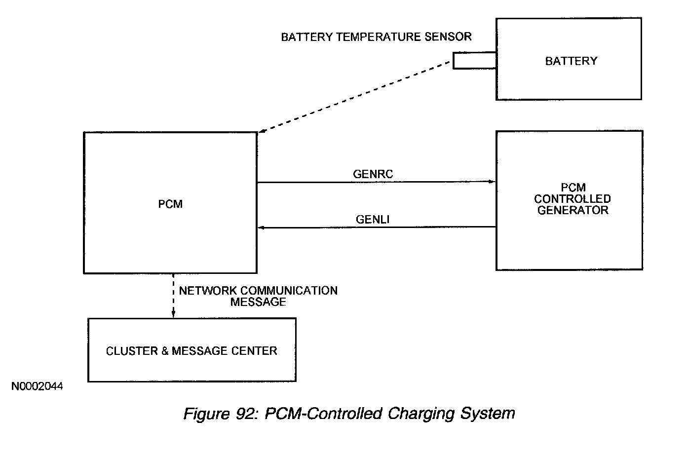 If the PCM detects a charging system error, it broadcasts a low voltage telltale (ON) network communication message which tells the cluster to illuminate the charge indicator. The charge indicator is illuminated if the PCM does not see a signal on the GENLI circuit for a time period greater than 500 milliseconds. This telltale command is also used to indicate over-voltage conditions detected by the PCM-controlled generator.