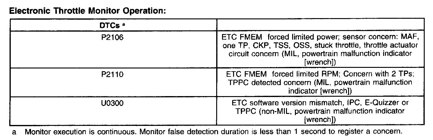 The ETC monitor system is distributed across 2 processors within the PCM: the main powertrain control processor unit (CPU) and a monitoring processor called an enhanced-quizzer (E-Quizzer) processor. The primary monitoring function is carried out by the independent plausibility check (IPC) software, which resides on the main processor. It is responsible for determining the driver-demanded torque and comparing it to an estimate of the actual torque delivered. If the generated torque exceeds driver demand by a specified amount, the IPC takes appropriate corrective action.