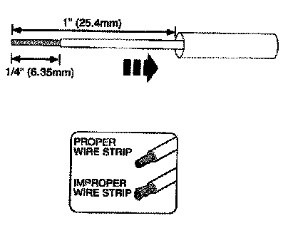 2. Strip 1/4" (6.35mm) of insulation from each wire end, taking care not to nick or cut wire strands.