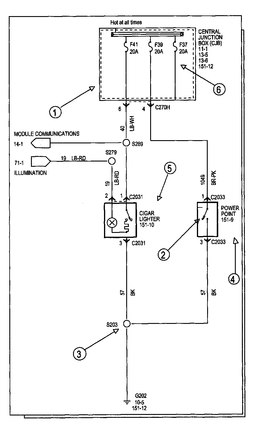 Each set normally starts with the component that powers the circuit, such as a fuse or the ignition switch. Current flow is shown from the power source at the top of the diagram to ground at the bottom of the diagram. In order to concentrate on the essential parts, power supply and ground connections are sometimes simplified by a dashed line in the diagrams. A full representation of the power supply of a fuse or the power distribution from a fuse to various components is given in the Power and Ground Distribution Diagrams. Full representation of the ground connections is shown in the Power and Ground Distribution Diagrams.