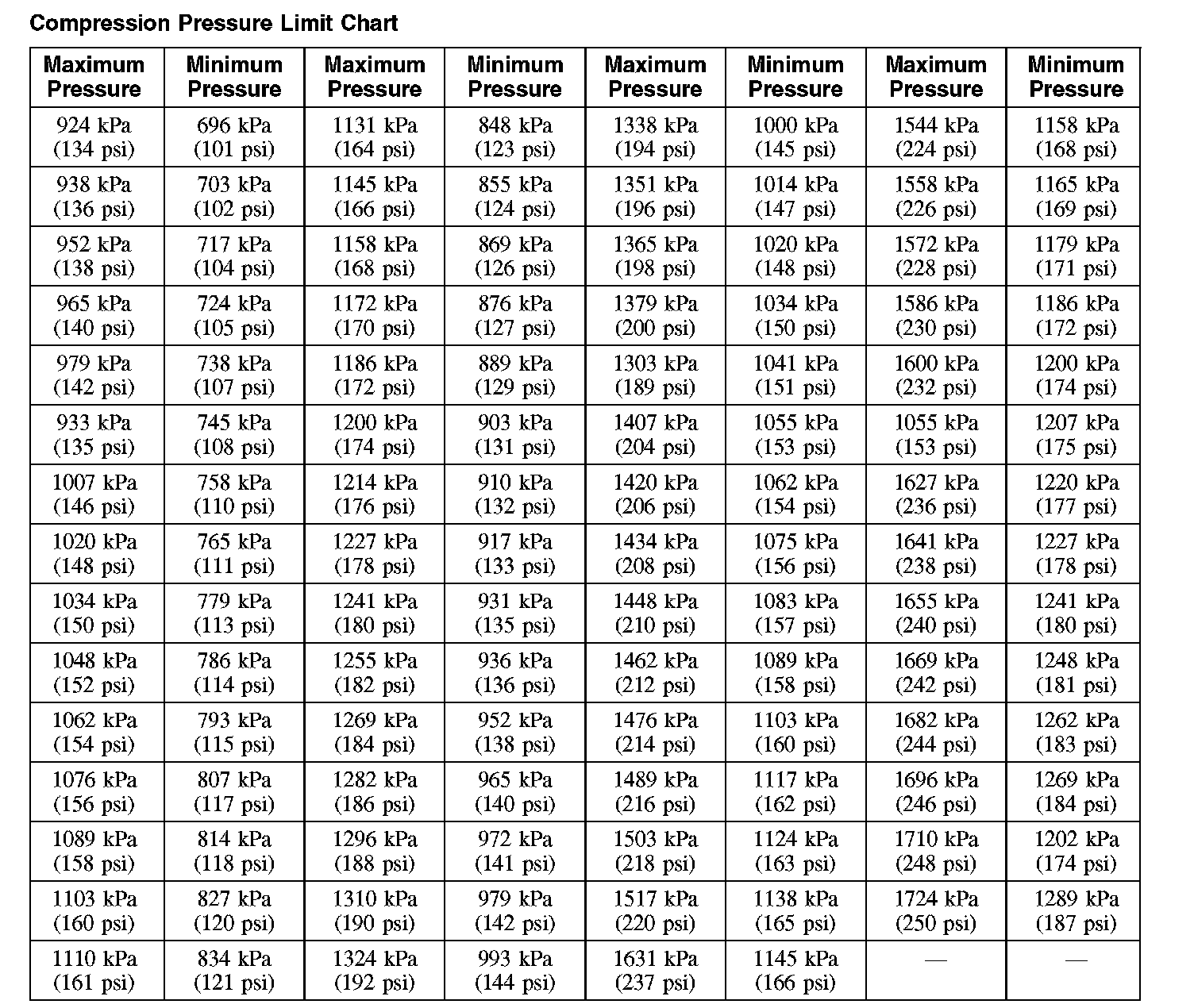 The indicated compression pressures are considered within specification if the lowest reading cylinder is at least 75% of the highest reading. Refer to the Compression Pressure Limit Chart.