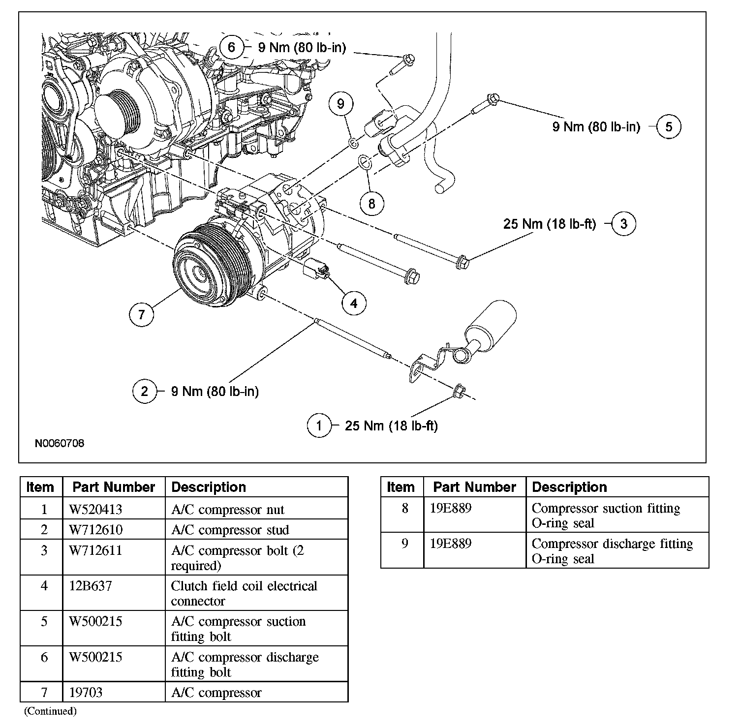 9. Remove the A/C compressor suction fitting bolt and disconnect the fitting.
