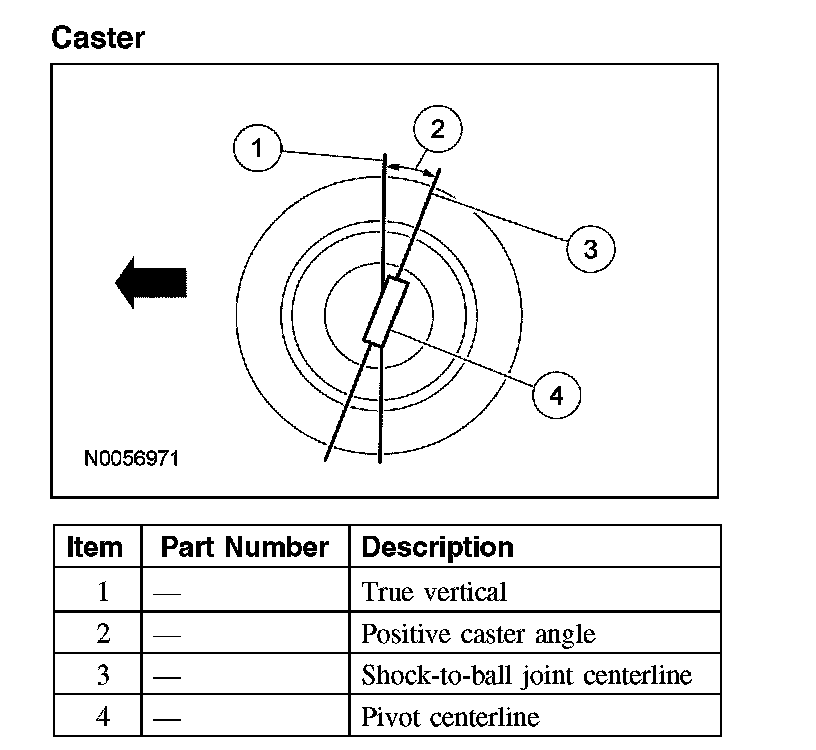 Caster is the deviation from vertical of an imaginary line drawn through the ball joints when viewed from the side. The caster specifications will give the vehicle the best directional stability characteristics when loaded and driven. The caster setting is not related to tire wear.