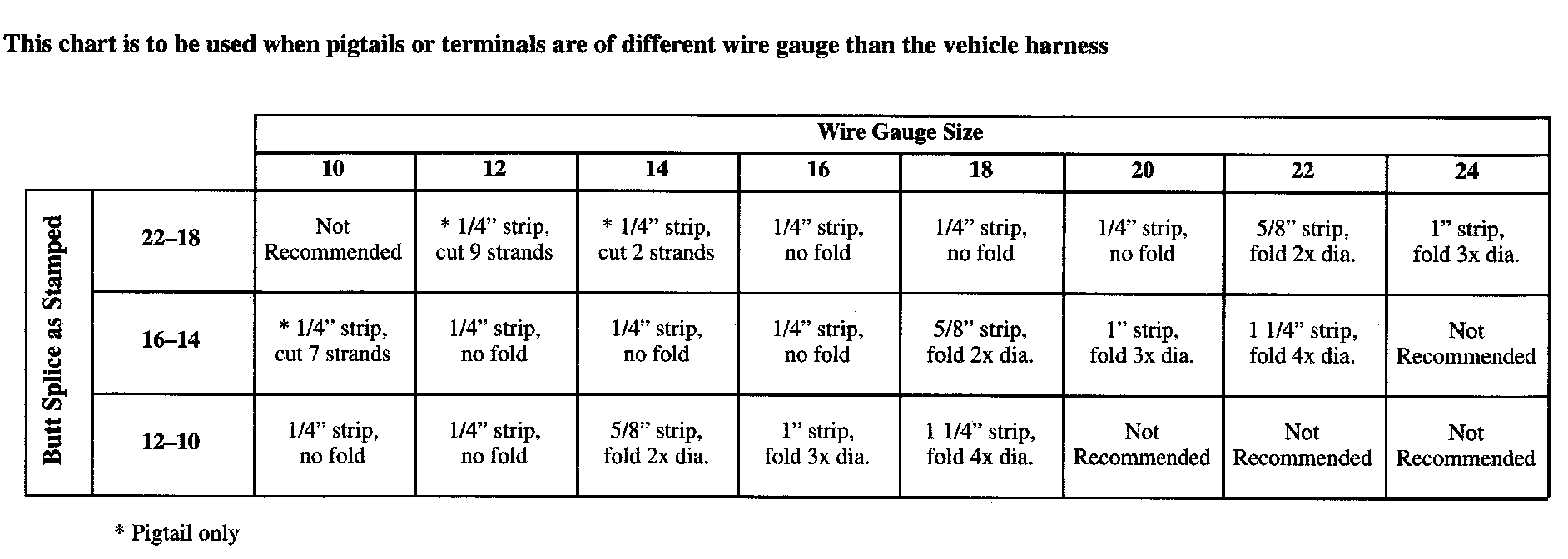 The given chart is to be used when pigtails or terminals are different wire gauge than the vehicle harness.