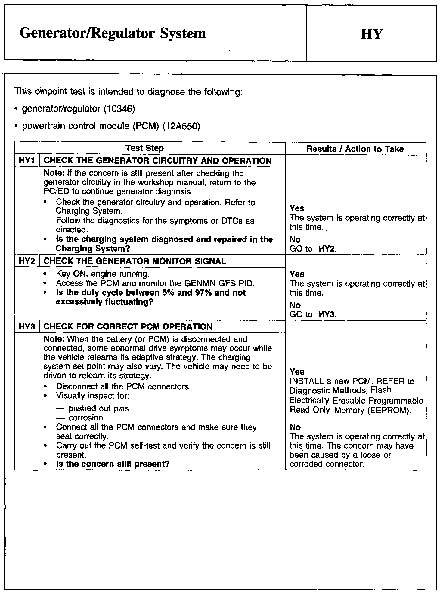 PINPOINT TEST HY: GENERATOR/REGULATOR SYSTEM