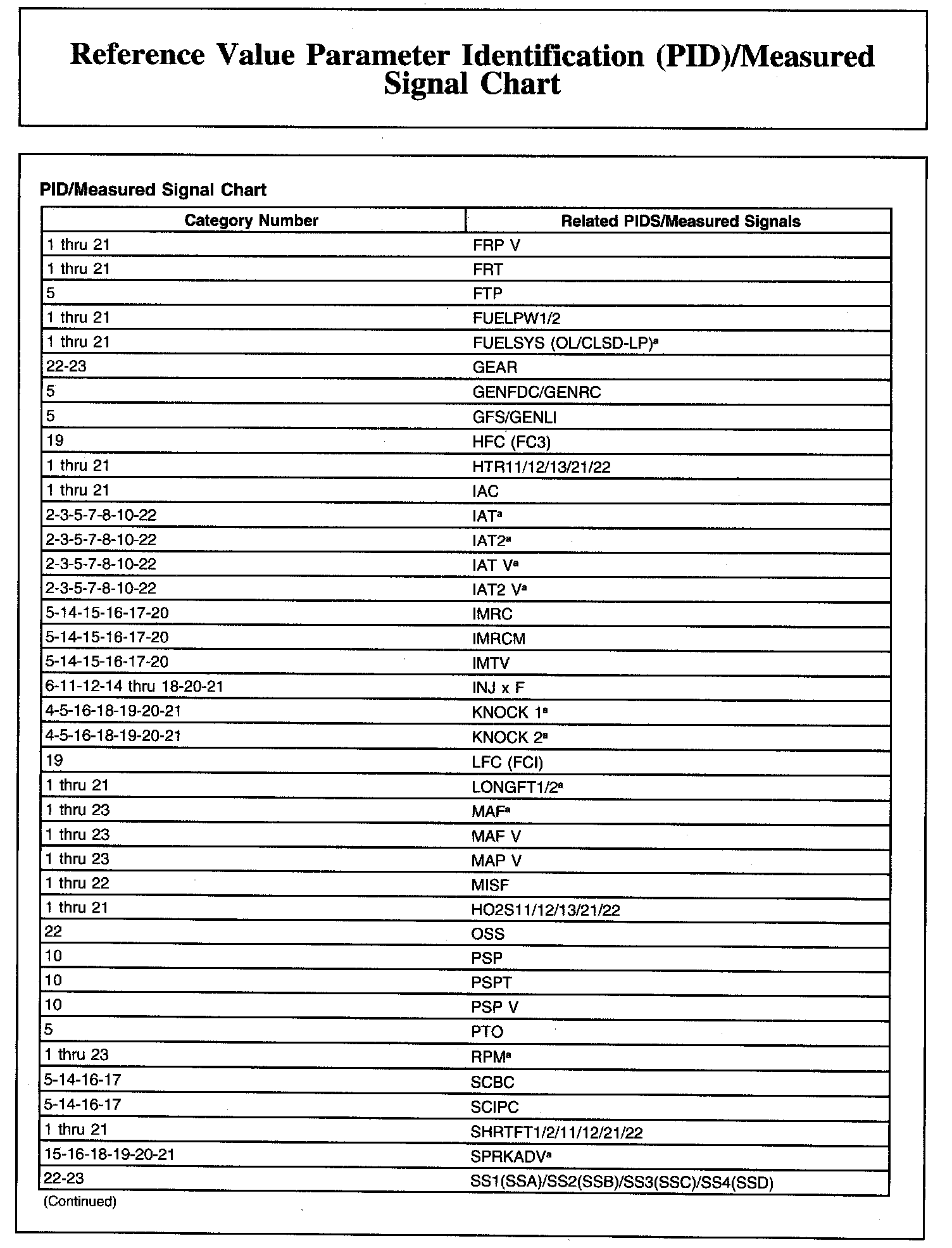 Reference Value Parameter Identification (PID)/Measured Signal Chart (Part 2):