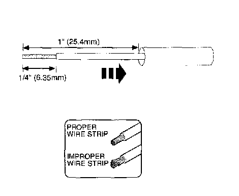 2. Strip 1/4" (6.35mm) of insulation from each wire end, taking care not to nick or cut wire strands.