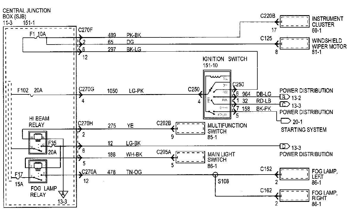 Each set normally starts with the component that powers the circuit, such as a fuse or the ignition switch. Current flow is shown from the power source at the top of the diagram to ground at the bottom of the diagram. A full representation of the power supply of a fuse or the power distribution from a fuse to various components is given in Power and Ground Distribution Diagrams. Full representation of the ground connections are shown in Power and Distribution Diagrams.