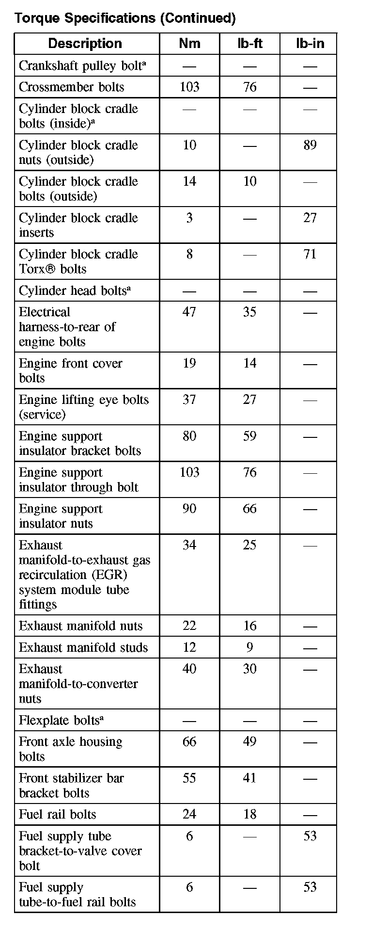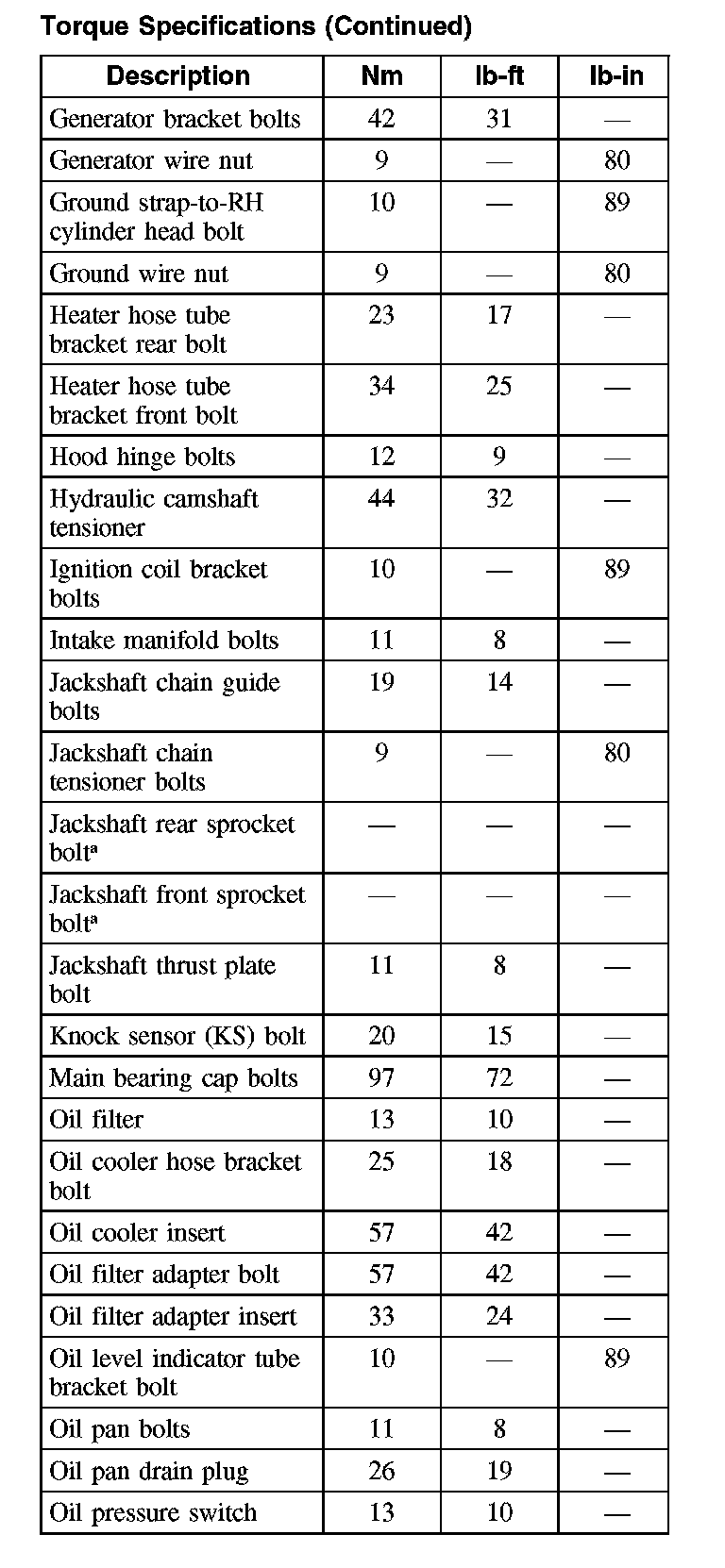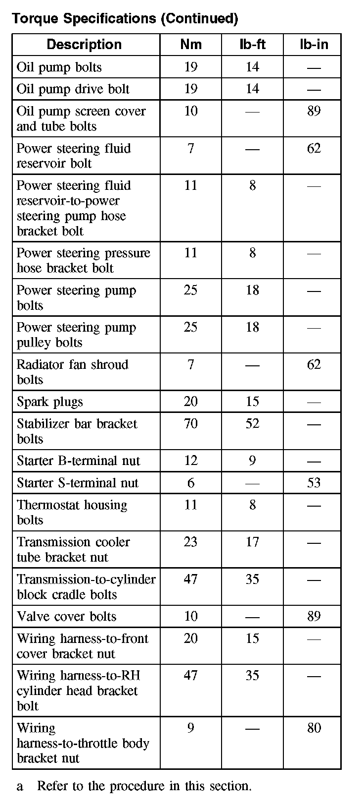 Torque Specification (Continued):
