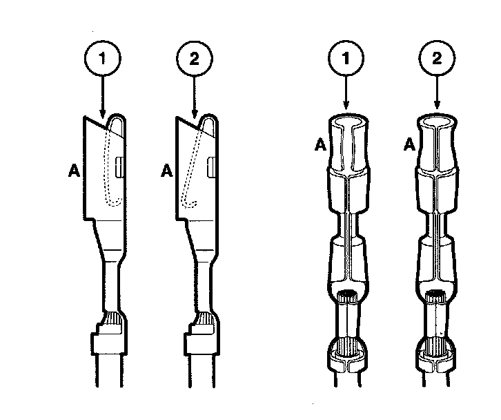 Any probe entering the terminal may enlarge the contact spring opening creating an intermittent signal. Insert the correct mating terminal (Location A) from the service kit and feel for a loose fit.