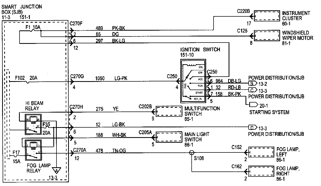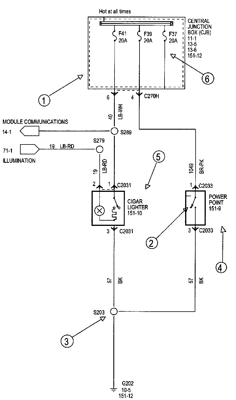 Each set normally starts with the component that powers the circuit, such as a fuse or the ignition switch. Current flow is shown from the power source at the top of the diagram to ground at the bottom of the diagram. A full representation of the power supply of a fuse or the power distribution from a fuse to various components is given in Power and Ground Distribution Diagrams. Full representation of the ground connections are shown in Power and Distribution Diagrams.