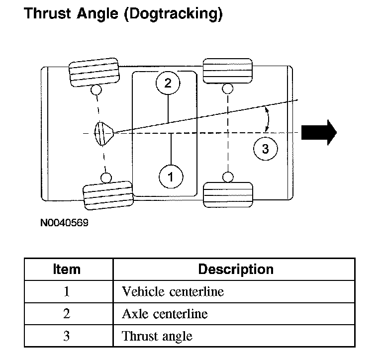 Incorrect thrust angle (also known as dogtracking) is the condition in which the rear axle is not square to the chassis. Heavily crowned roads can give the illusion of dogtracking.