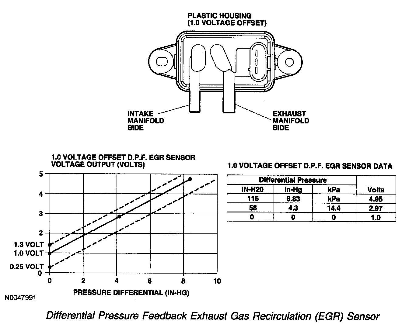 The differential pressure feedback EGR sensor is a ceramic, capacitive-type pressure transducer that monitors the differential pressure across a metering orifice located in the orifice tube assembly. The differential pressure feedback EGR sensor receives this signal through 2 hoses referred to as the downstream pressure hose (REF SIGNAL) and upstream pressure hose (HI SIGNAL). The HI and REF hose connections are marked on the differential pressure feedback EGR sensor housing for identification (note that the HI signal uses a larger diameter hose). The differential pressure feedback EGR sensor outputs a voltage proportional to the pressure drop across the metering orifice and supplies it to the PCM as EGR flow rate feedback.