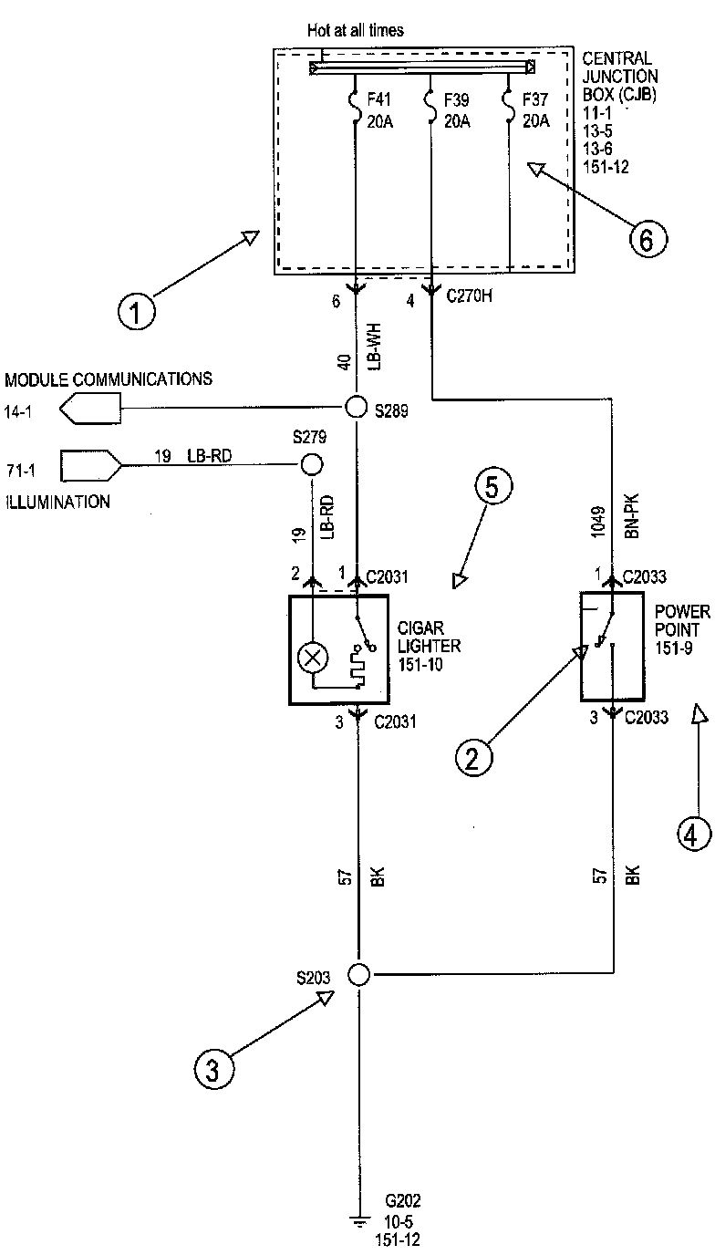 Each set normally starts with the component that powers the circuit, such as a fuse or the ignition switch. Current flow is shown from the power source at the top of the diagram to ground at the bottom of the diagram. A full representation of the power supply of a fuse or the power distribution from a fuse to various components is given in Power and Ground Distribution Diagrams. Full representation of the ground connections are shown in Power and Distribution Diagrams.