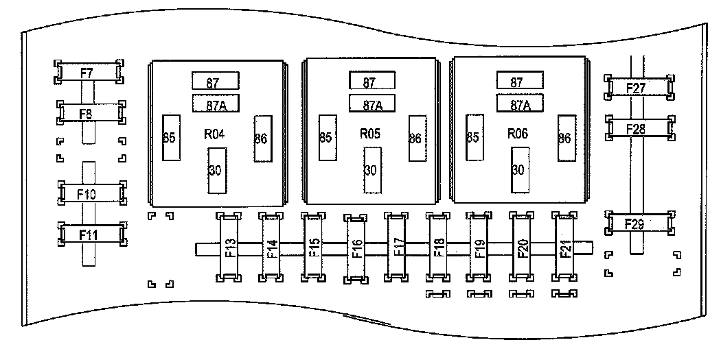 Fuse and Relay Information contains a view of the fuse/relay box in which fuses and relays are identified, numbered and named. Fuse and relay numbering and naming follow the indication of the fuse panel cover. In addition, for all removable relays, pin positions are added to illustrate proper orientation.