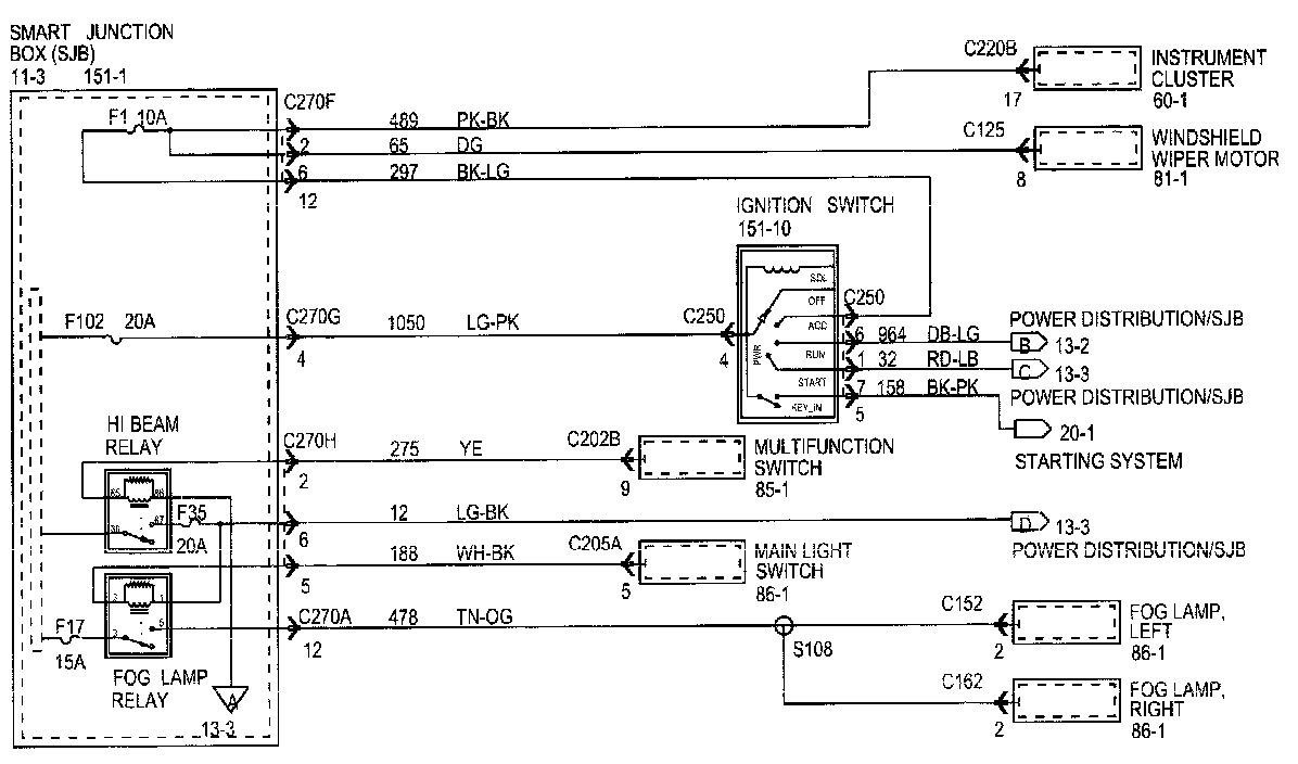 Each set normally starts with the component that powers the circuit, such as a fuse or the ignition switch. Current flow is shown from the power source at the top of the diagram to ground at the bottom of the diagram. A full representation of the power supply of a fuse or the power distribution from a fuse to various components is given in Power and Ground Distribution Diagrams. Full representation of the ground connections are shown in Power and Distribution Diagrams.