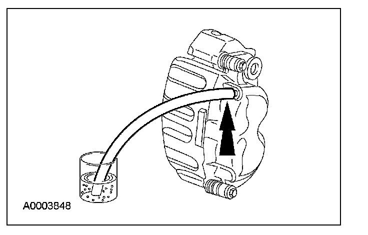 9. Loosen the RH front brake caliper bleeder screw until a stream of brake fluid comes out. While the assistant maintains pressure on the brake pedal, tighten the bleeder screw.