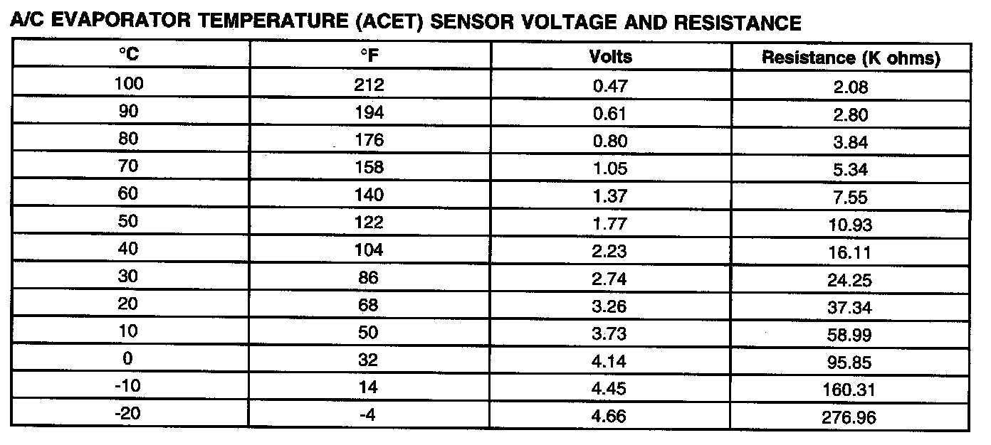 A/C Evaporator Temperature (ACET) Sensor Voltage And Resistance: