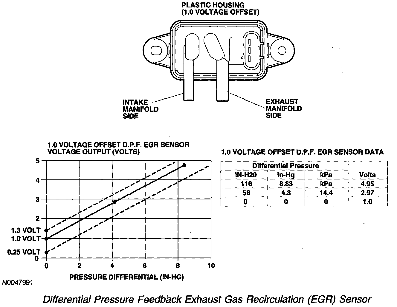 The differential pressure feedback EGR sensor is a ceramic, capacitive-type pressure transducer that monitors the differential pressure across a metering orifice located in the orifice tube assembly. The differential pressure feedback EGR sensor receives this signal through 2 hoses referred to as the downstream pressure hose (REF SIGNAL) and upstream pressure hose (HI SIGNAL). The HI and REF hose connections are marked on the differential pressure feedback EGR sensor housing for identification (note that the HI signal uses a larger diameter hose). The differential pressure feedback EGR sensor outputs a voltage proportional to the pressure drop across the metering orifice and supplies it to the PCM as EGR flow rate feedback.