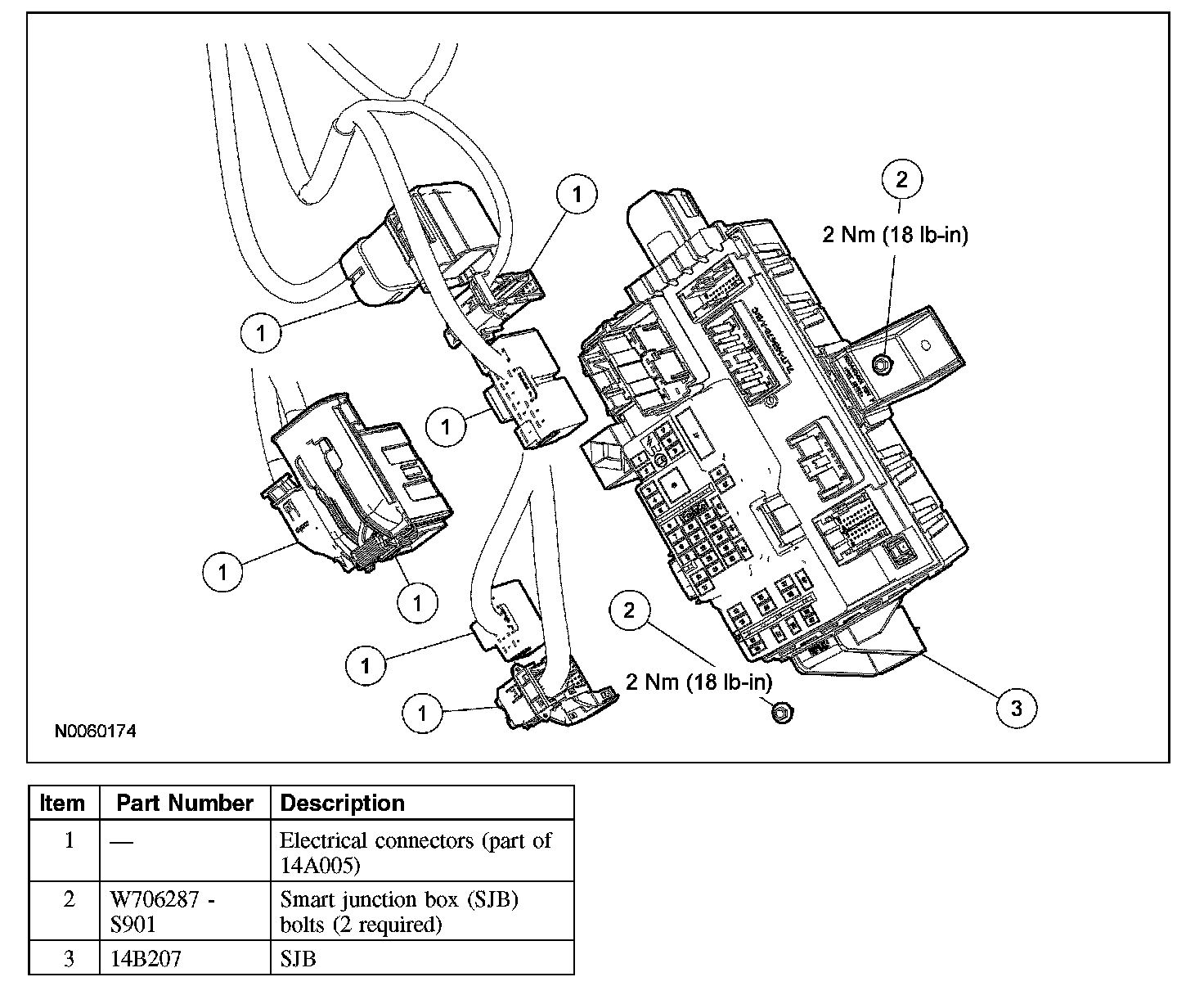 NOTE: Prior to the removal of the module, it is necessary to upload the module configuration information to a scan tool. This information must be downloaded into the new SJB after installation.