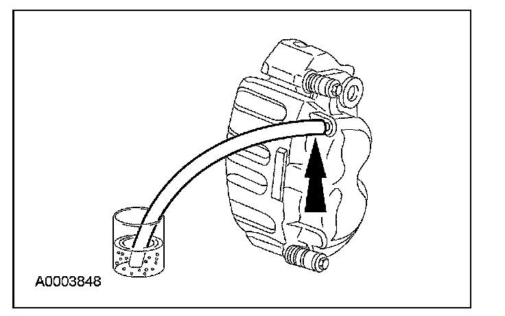 9. Loosen the RH front brake caliper bleeder screw until a stream of brake fluid comes out. While the assistant maintains pressure on the brake pedal, tighten the bleeder screw.