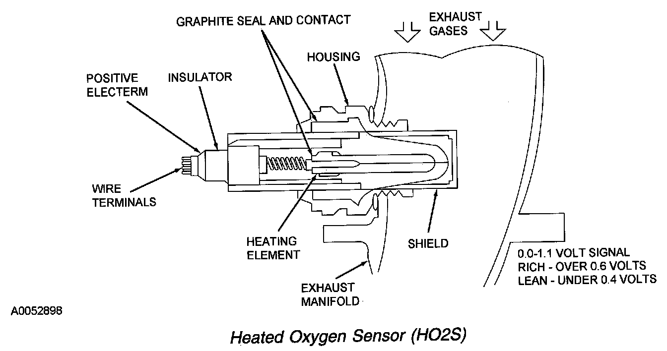 The HO2S detects the presence of oxygen in the exhaust and produces a variable voltage according to the amount of oxygen detected. A high concentration of oxygen (lean air/fuel ratio) in the exhaust produces a voltage signal less than 0.4 volt. A low concentration of oxygen (rich air/fuel ratio) produces a voltage signal greater than 0.6 volt. The HO2S provides feedback to the PCM indicating air/fuel ratio in order to achieve a near stoichiometric air/fuel ratio of 14.7:1 during closed loop engine operation. The HO2S generates a voltage between 0.0 and 1.1 volts.