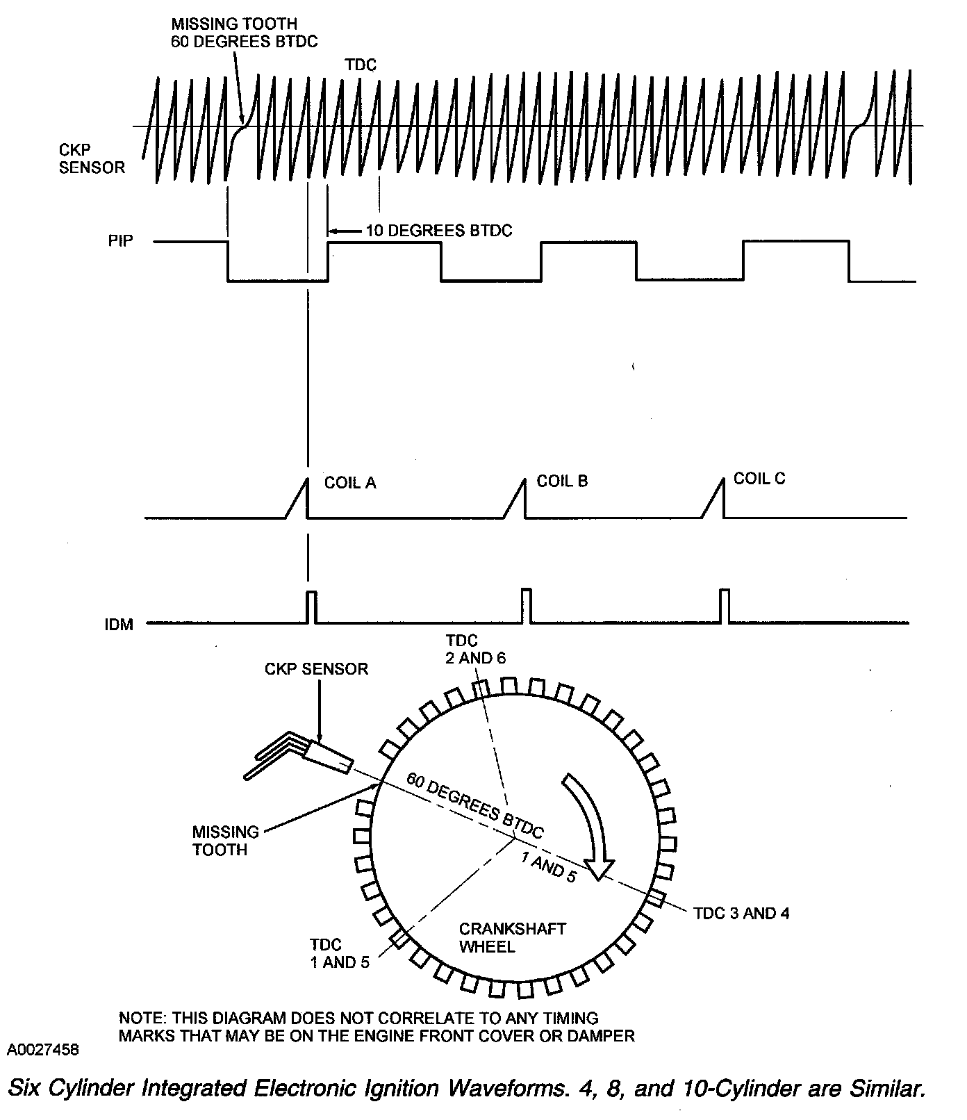 1. The CKP sensor is used to indicate the crankshaft position and speed by sensing a missing tooth on a pulse wheel mounted to the crankshaft. The CMP sensor is used by the COP integrated electronic ignition system to identify the compression stroke of cylinder 1 and to synchronize the firing of the individual coils.