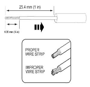 2. Strip 6.35mm (1/4 in) of insulation from each wire end, taking care not to nick or cut wire strands.