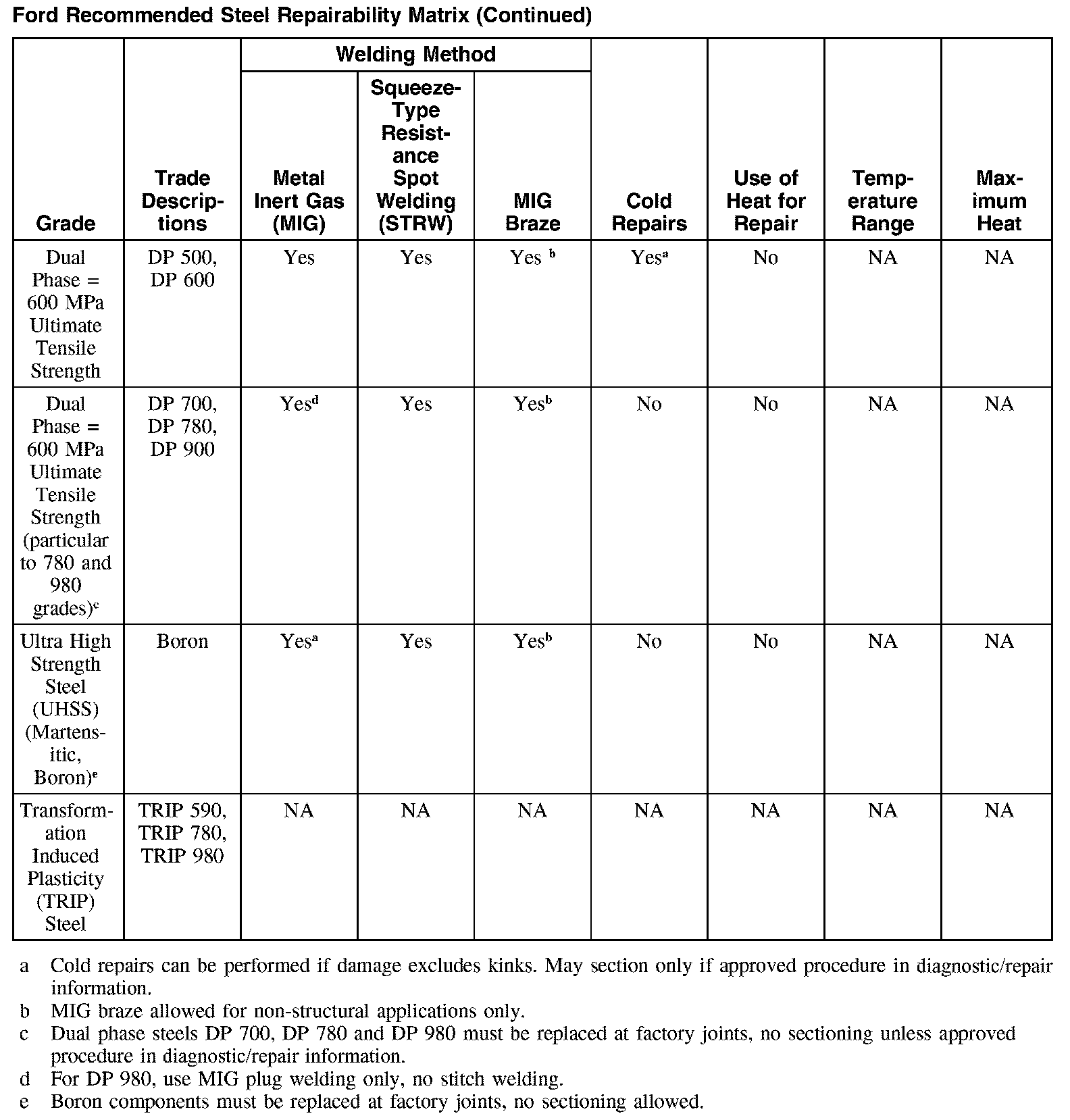 Ford Recommended Steel Repairability Matrix (Part 2):