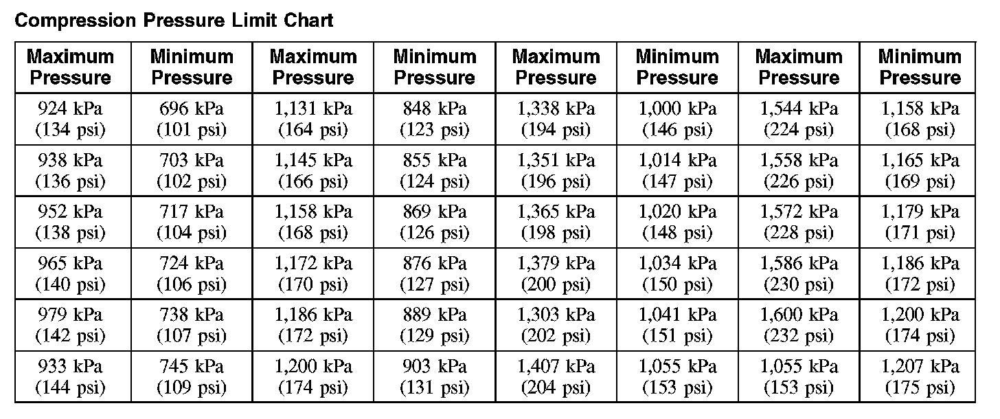 The indicated compression pressures are considered within specification if the lowest reading cylinder is at least 75% of the highest reading. Refer to the Compression Pressure Limit Chart.