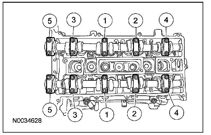 Stage 1: Tighten the camshaft bearing bolt caps one turn at a time until tight.