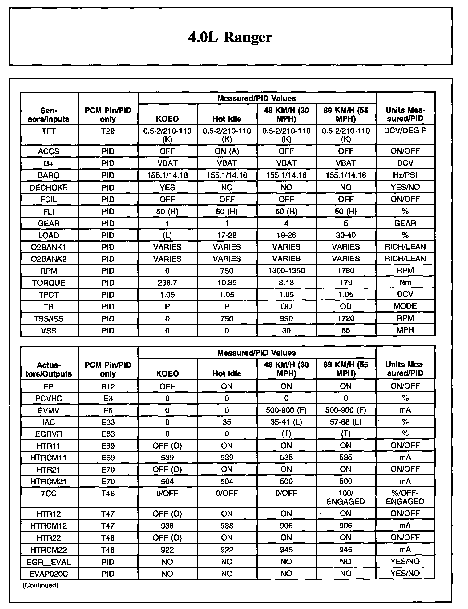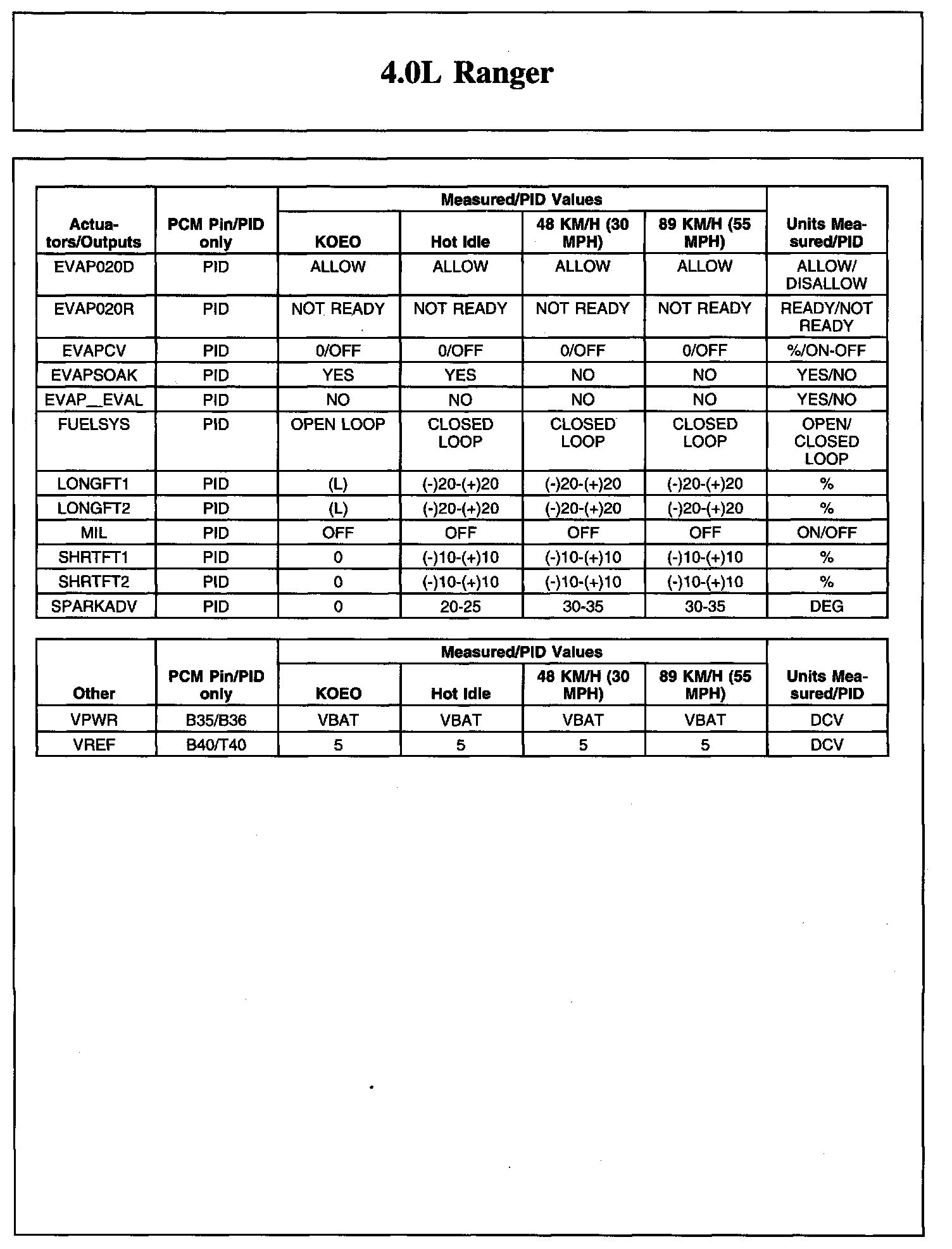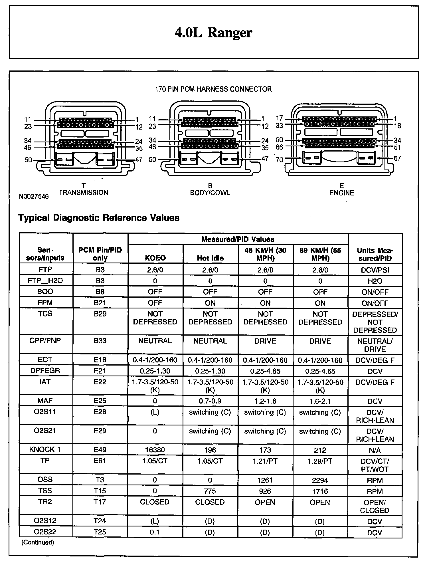 TYPICAL DIAGNOSTIC REFERENCE VALUES4.0L Ranger (Part 1):