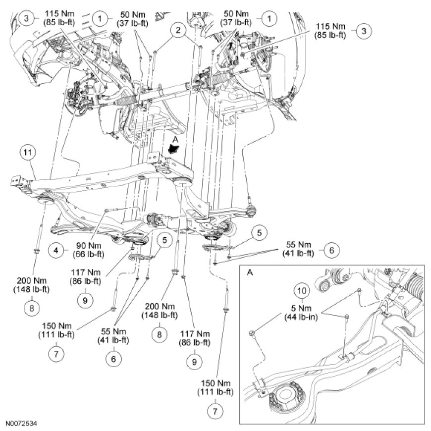 - To install, tighten the front subframe rear bolts to 150 Nm (111 lb-ft).
