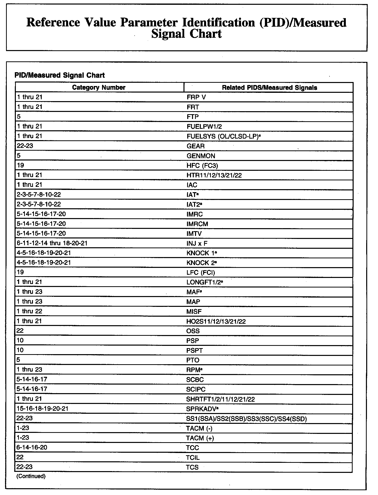 Home >> Ford >> 2008 >> Taurus FWD V6-3.5L >> Repair and Diagnosis >> Powertrain Management >> Computers and Control Systems >> Testing and Inspection >> Scan Tool Testing and Procedures >> Reference Value Parameter Identification (PID)/Measured Signal Chart
